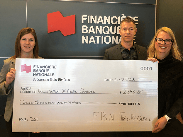 L’équipe de la Financière Banque Nationale de Trois-Rivières, où travaille Véronique Beauchamp, conseillère en placements, a remis un don de 2343,84 $ à l’Association X Fragile Québec.